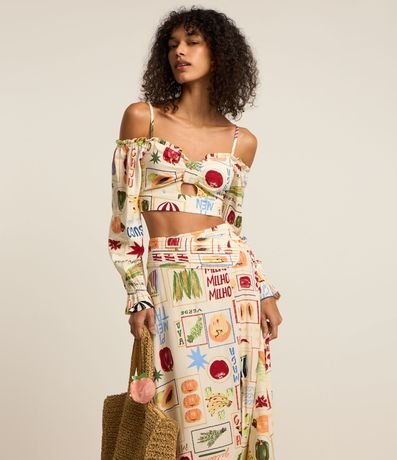 Ref: Saia new midi confeccionada em viscose + linho, cós trabalhado com textura em listras e estampa frutinhas.
