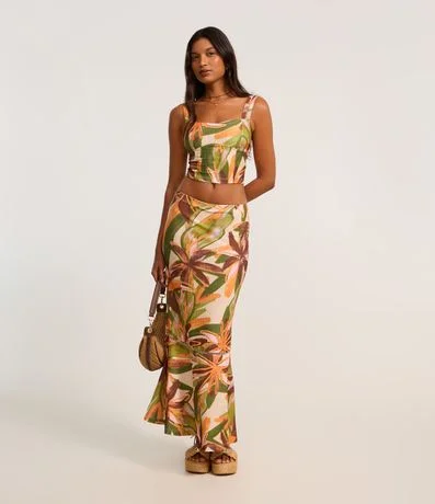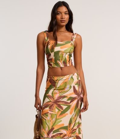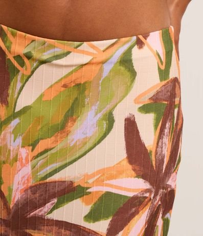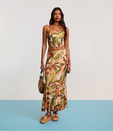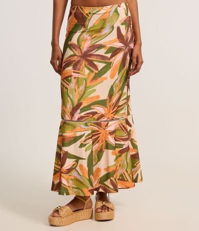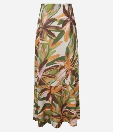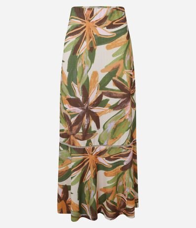 Ref: Saia new midi, evasê com cós elástico, texturizada e com estampa de folhagem em repetição.