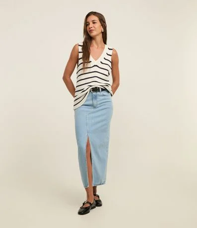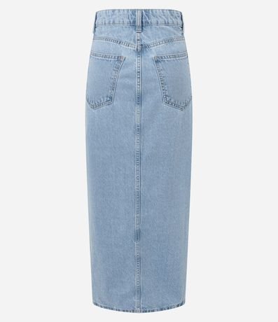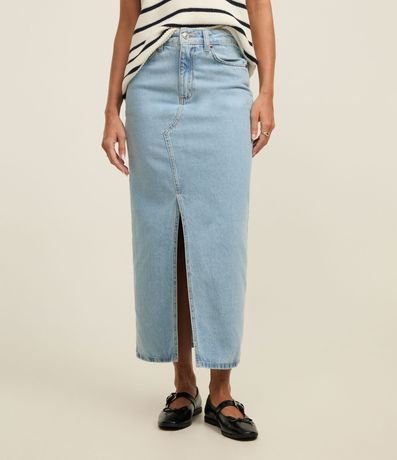Ref: Saia midi feminina, confeccionada em jeans, composto por algodão certificado BCI. A peça conta com passantes no cós, fechamento em botão e fenda frontal.