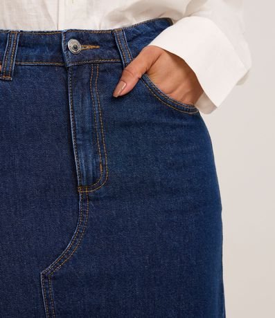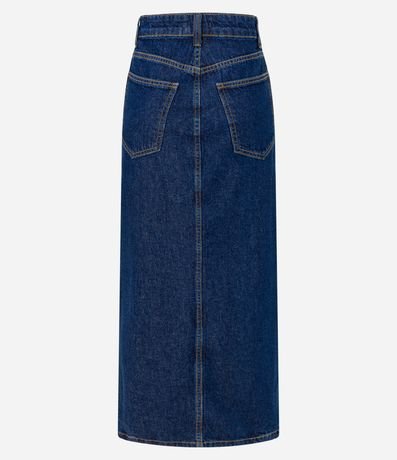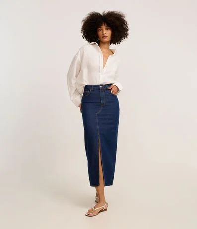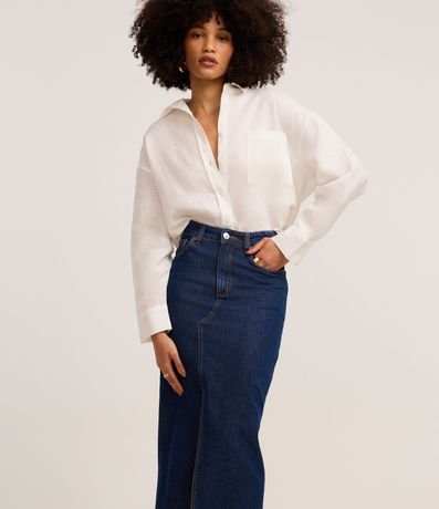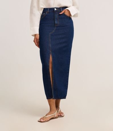 Saia midi feminina, confeccionada em jeans, composto por algodão certificado BCI. A peça conta com passantes no cós, fechamento em botão e fenda frontal.