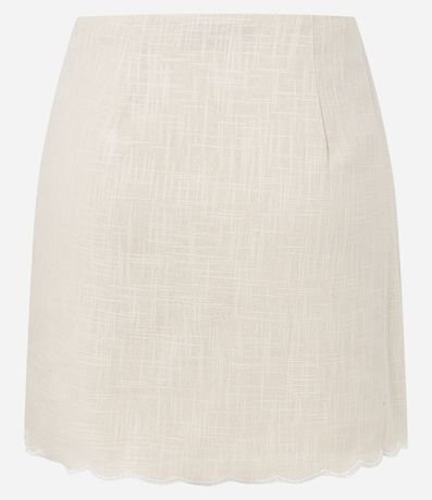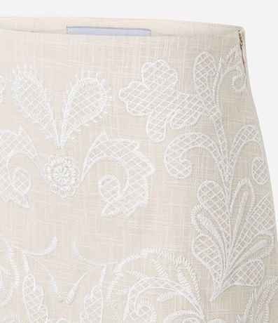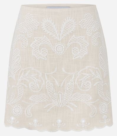 Ref: Saia reta ajustada e curta, confeccionada em algodão com efeito de linho, com fechamento lateral por zíper, barra nuvem bordada e bordados paisley na frente. Este produto possui material mais sustentável em sua composição, sendo ambientalmente mais responsável.