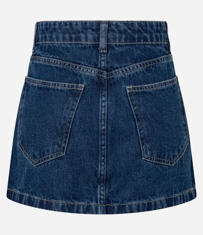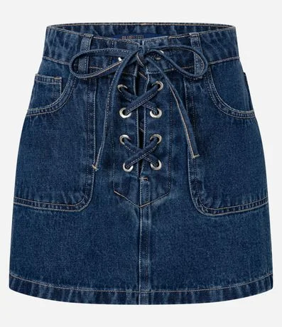Ref: Saia feminina em jeans confeccionado com algodão certificado bci, peça curta com cós passante, amarração frontal e bolsos largos.
