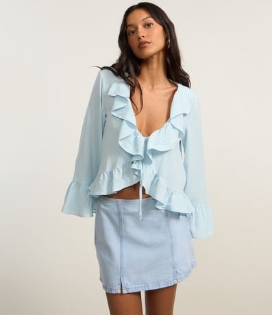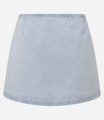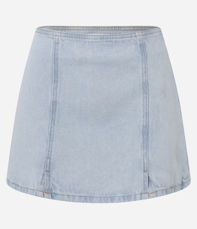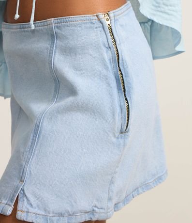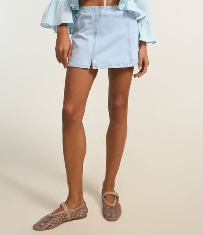 Ref: Saia curta, confeccionada em jeans com algodão bci mais sustentável, fechamento por zíper na lateral e fendinhas na barra.