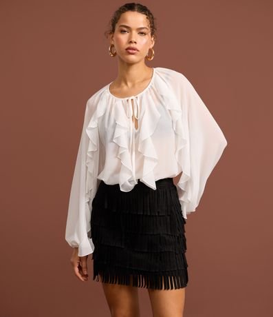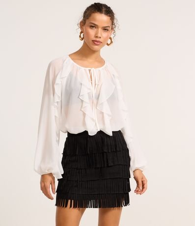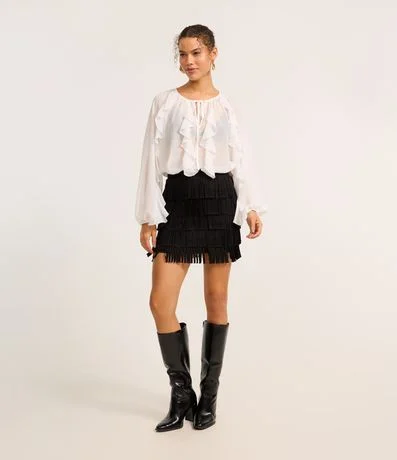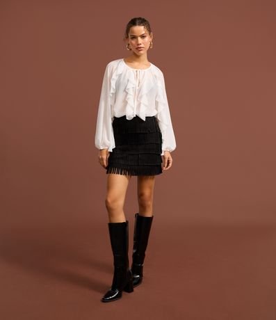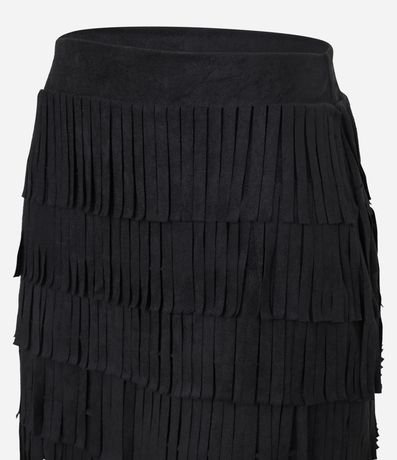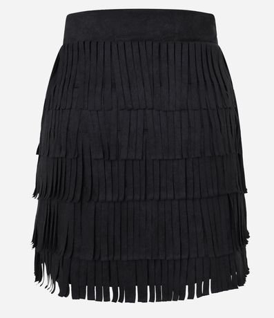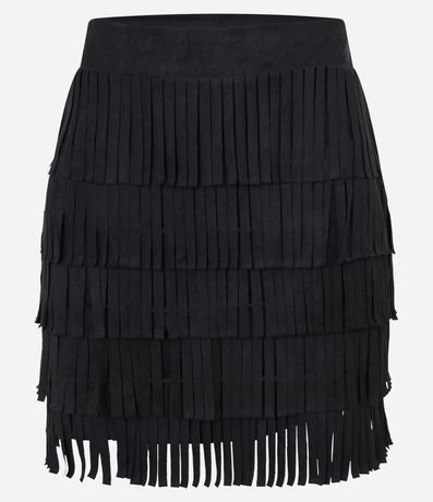 Ref: Saia feminina confeccionada em suede, de modelo mini saia, com corte reto e cós fixo. Possui camadas em franjas, proporcionando uma maior aderência ao estilo folk e western.