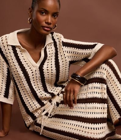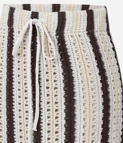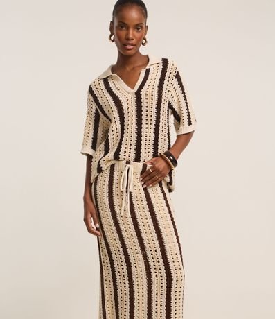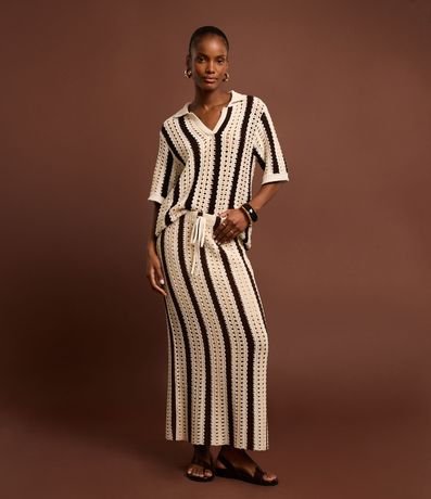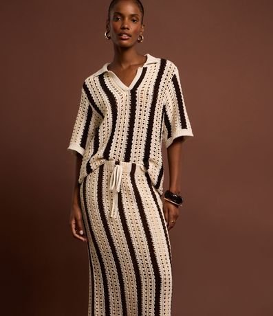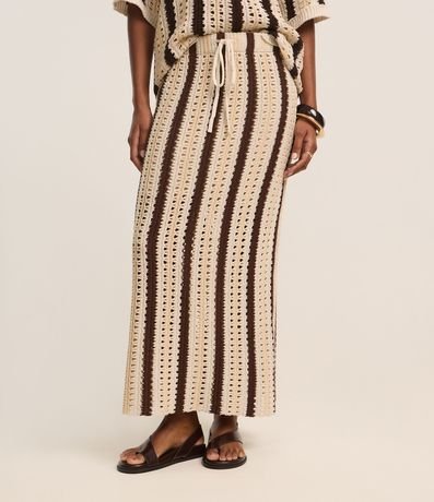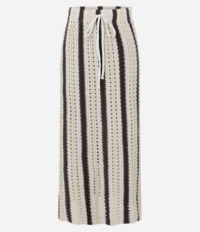 Ref: Saia reta midi, confeccionada em tricô, com elástico e amarração no cós, listras verticais e pontos vazados em efeito crochê. Este produto possui material mais sustentável em sua composição, sendo ambientalmente mais responsável.