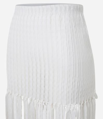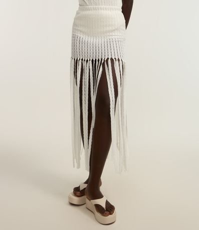 Saia long midi, reta, cós elástico, texturizada com franjas.
