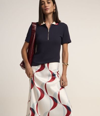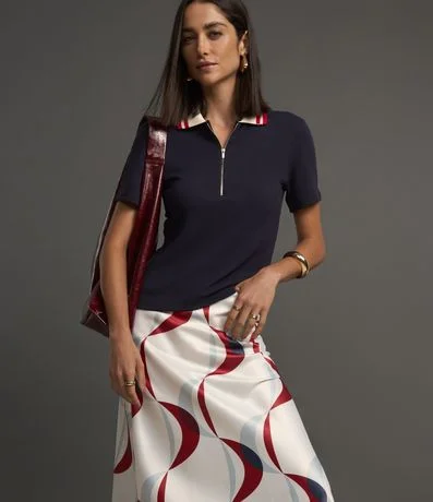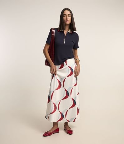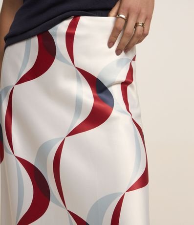 Ref: Saia feminina acetinada, no modelo reta midi com estampa de linhas geométricas abstrata.