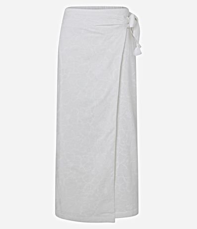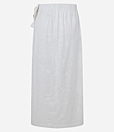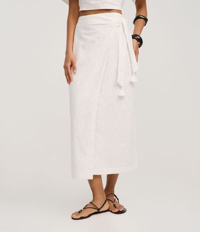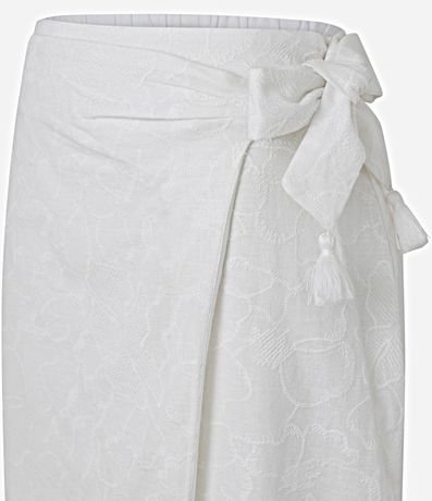 Saia reta midi, em laise, com amarração na cintura do transpasse e bordados geométricos. Este produto possui material mais sustentável em sua composição, sendo ambientalmente mais responsável.