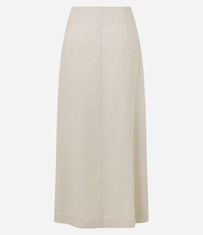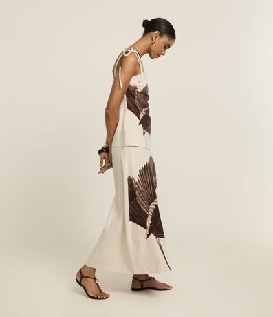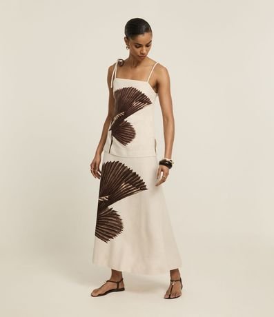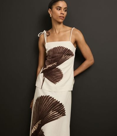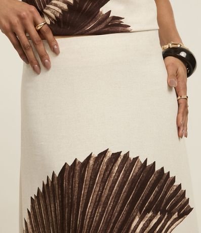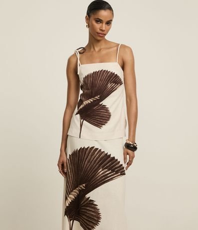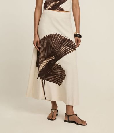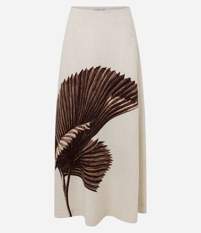 Ref: Saia reta midi, confeccionada em viscolinho com 15% de linho, com pences atrás. Estampa com folhagem em formato que remete à um leque.