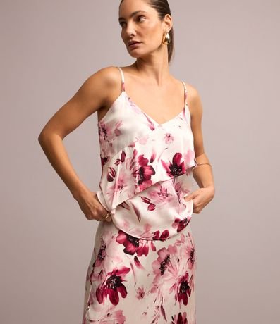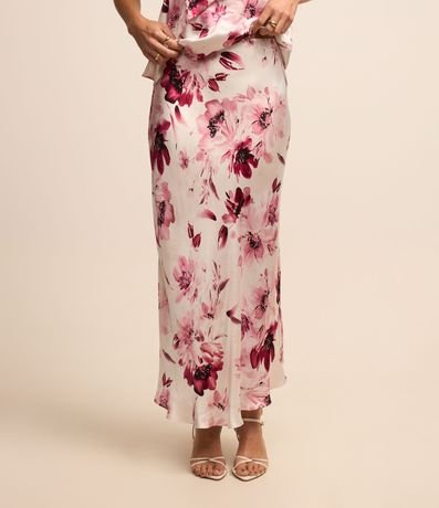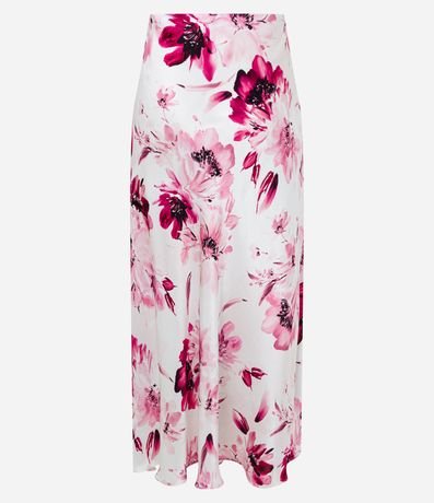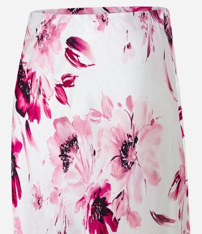 Ref: Saia slip evasê com comprimento midi, confeccionada em tecido acetinado com flores em estilo aquarela estampadas.