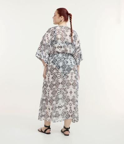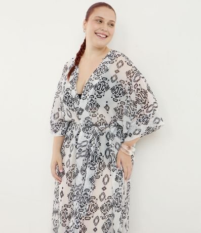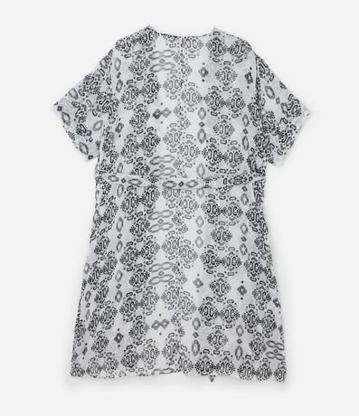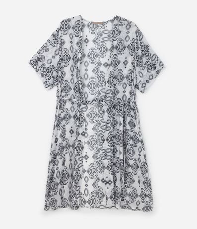 Ref: Saída de praia feminina confeccionada em chiffon através de boas práticas ambientais, no modelo alongado. Possui manga curta, cinto faixa para amarração e estampa étnica.