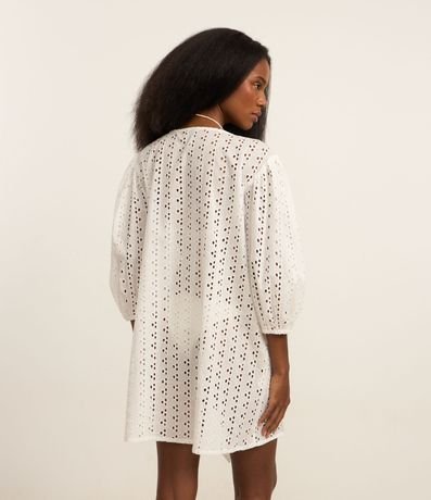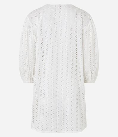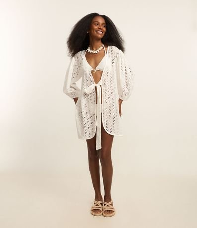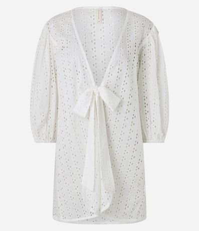 Ref: Saída de praia confeccionada em laise de algodão certificado. A bata tem mangas bufantes, decote V e laço frontal.