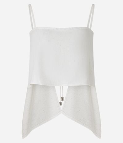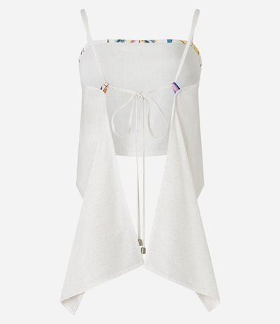 Saída de praia confeccionada em viscolinho sem estampa. A blusa cropped tem decote quadrado, alcinhas que amarram nas costas, pontas alongadas na parte traseira e detalhes estampados.