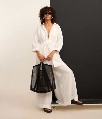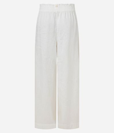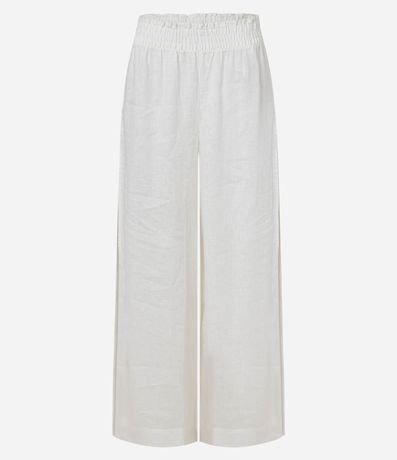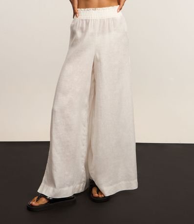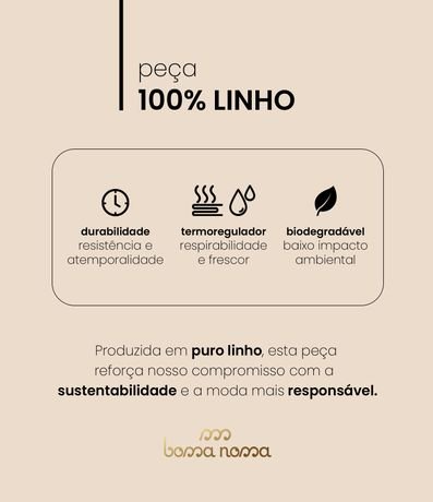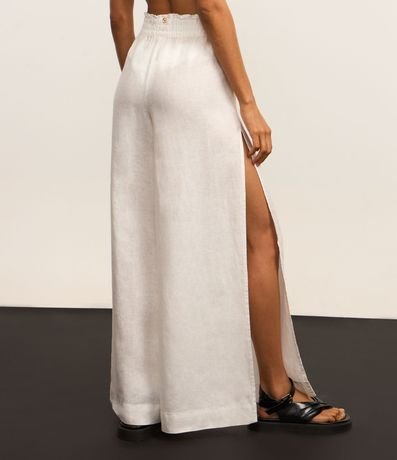Saída de praia confeccionada totalmente em linho. A calça possui cintura elástica e fendas laterais.