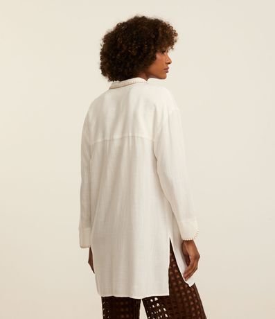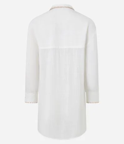 Ref: Saída de praia confeccionada em viscose certificada. A superfície é levemente texturizada, lembrando linho. A peça modelo camisa alongada tem mangas longas, gola colarinho e pespontos contrastantes.