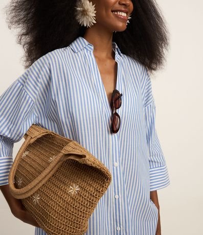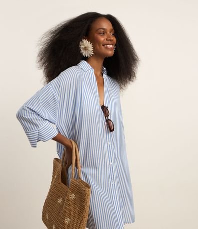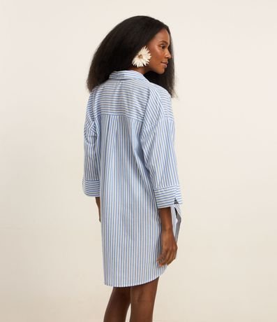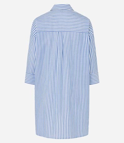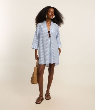 A peça estilo chemise tem gola camisa, mangas longas, abotoamento frontal e estampa de listras verticais.