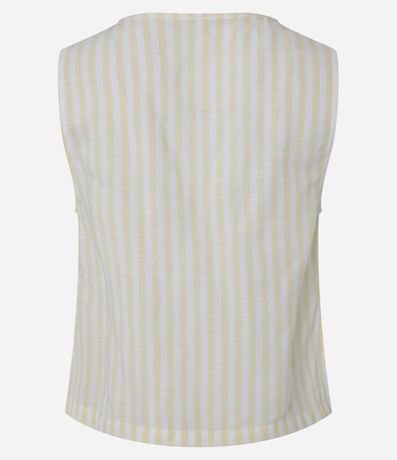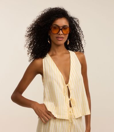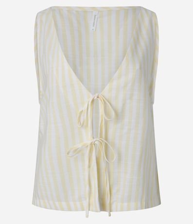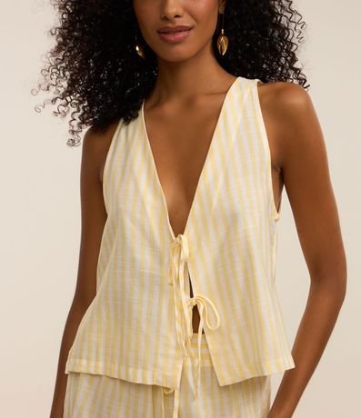 Ref: Saída de praia, modelo colete, confeccionado em algodão e viscose mais sustentáveis com amarrações frontais para fechamento. Listras verticais em fios tintos e amarrações em laço fazem parte desta peça.