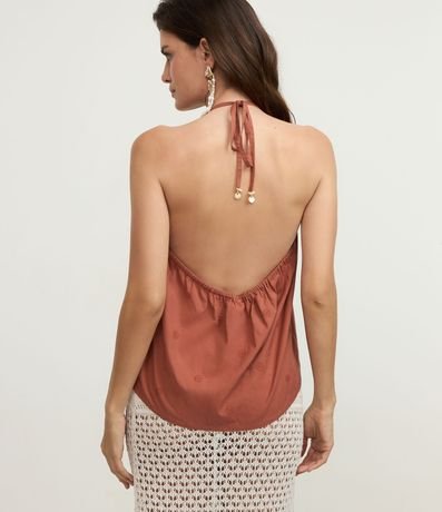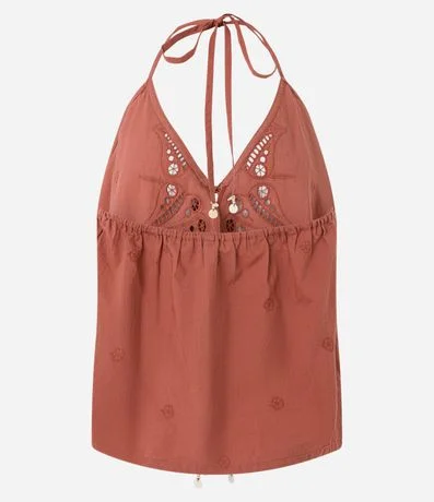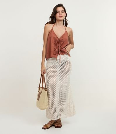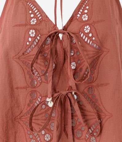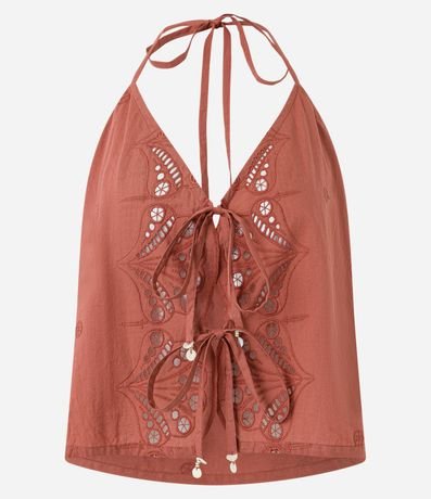 Saída de praia confeccionada em laise de algodão BCI. O colete frente única tem amarração no pescoço e laços frontais.