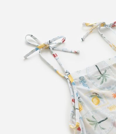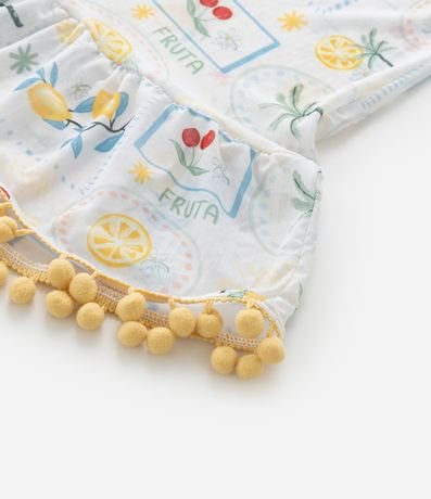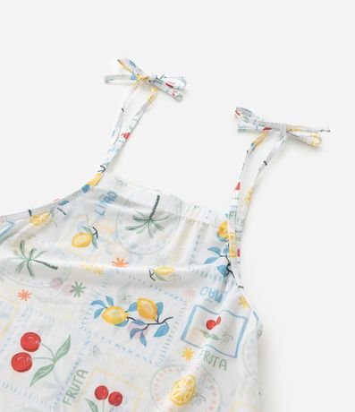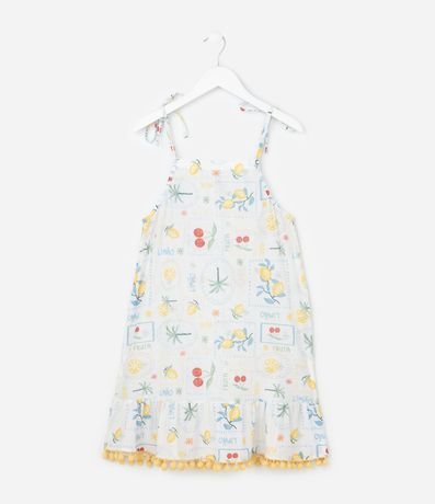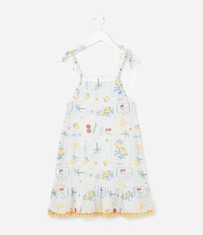Saída de praia infantil, confeccionada em tule, com decote quadrado, alças finas, com lacinhos, estampa de frutinhas e babado na barra com mini pompons.