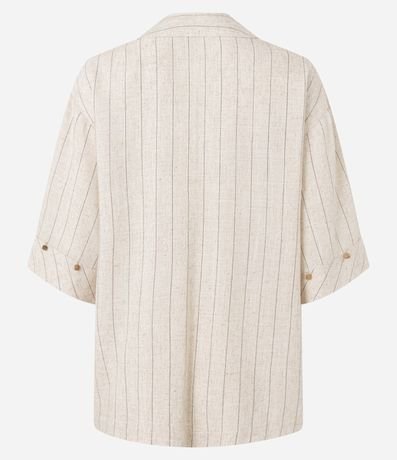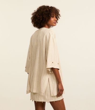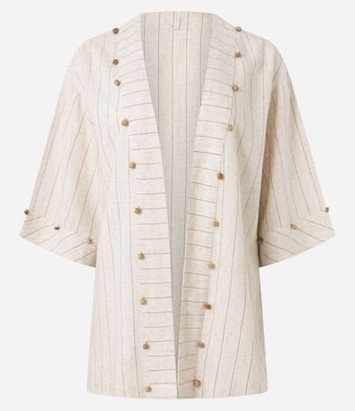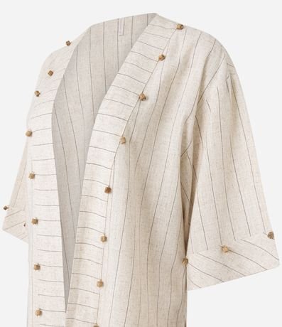 Ref: Saída de praia confeccionada com viscose certificada e linho. A peça é um kimono com abertura frontal total, estampa risca de giz e aplicação de miçangas de madeira.