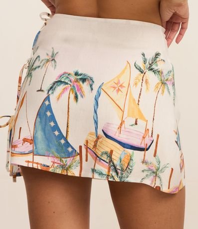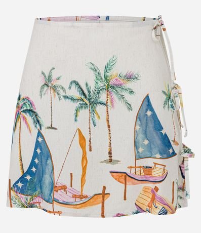 Ref: Saída de praia confeccionada em viscolinho composto por viscose certificada. A saia curta tem lacinhos laterais e estampa de paisagem praiana com jangadas.