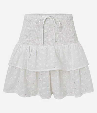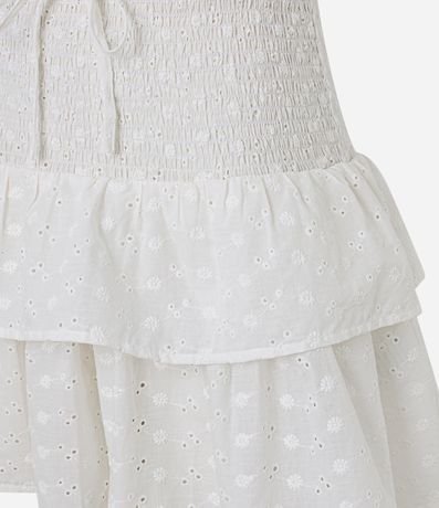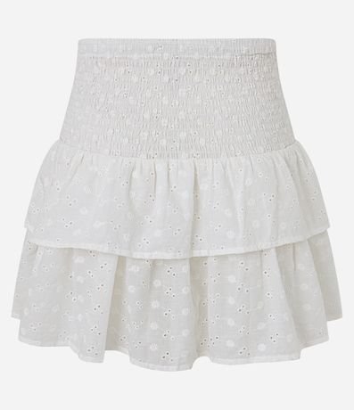 Ref: Saída de praia confeccionada em laise de algodão BCI. A saia curta tem cós largo em lastex e camadas de babados.