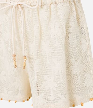 Ref: Short de telinha com textura de palmeiras. A saída de praia tem amarração na cintura e aviamentos de madeira.