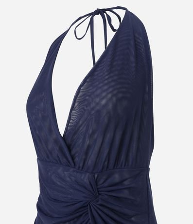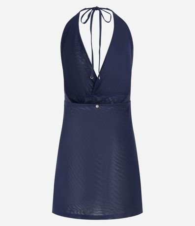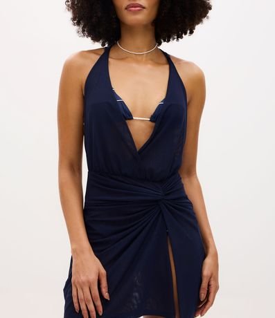 Ref: Saída de praia feminina confeccionada em tule, no modelo vestido. Possui decote v, amarração no pescoço, sem mangas e detalhe torcido.