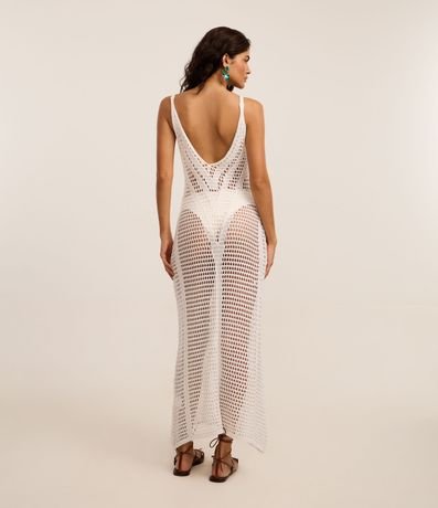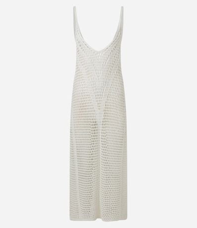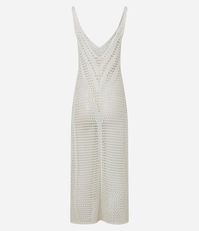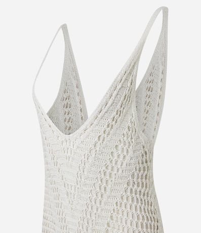 Ref: Saída de praia com efeito crochê. O vestido tem alças finas fixas e decote V.