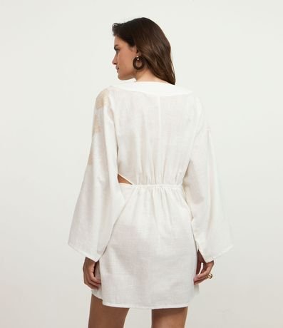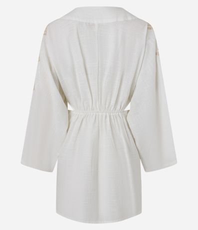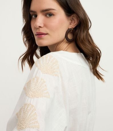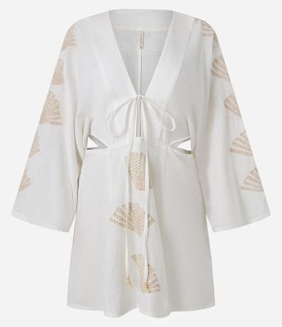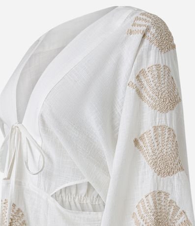 Ref: Vestido curto confeccionado em voil de algodão BCI. A peça tem decote V com amarração, vazados laterais, mangas longas e bordados de conchas do mar.