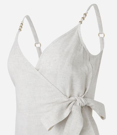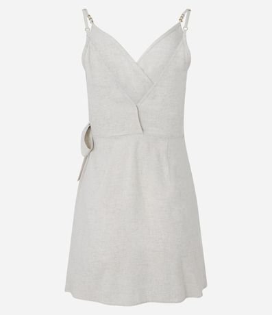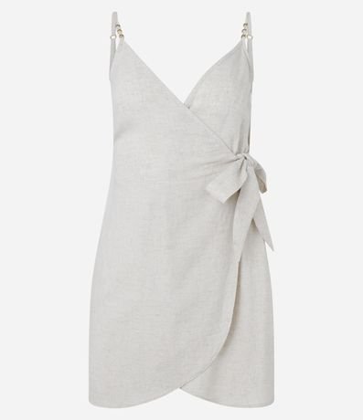 Saída de praia de modelo vestido, curto, confeccionado em viscode e linho, sem mangas e com alcinhas finas reguláveis. Possui decote V, transpasse com amarração lateral e detalhe metalizado nas alças.