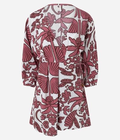 Saída de praia confeccionada em viscolinho estampado de flores. O vestido curto tem mangas longas, decote V cruzado, amarração lateral e elástico nos punhos.