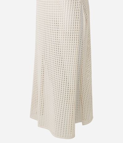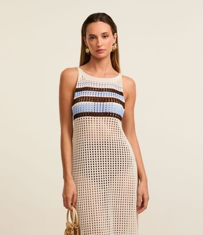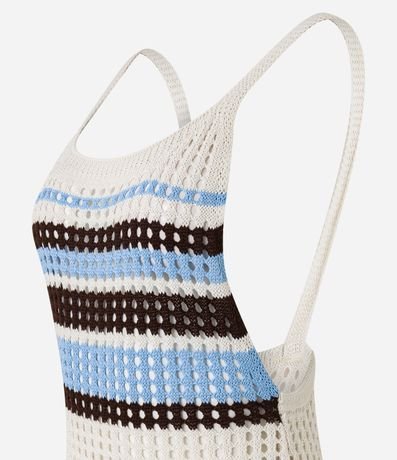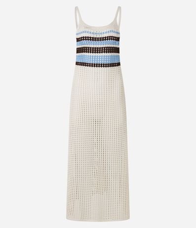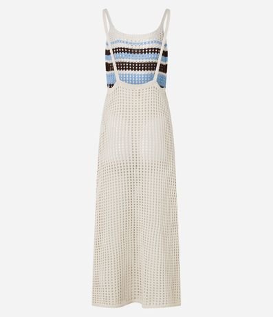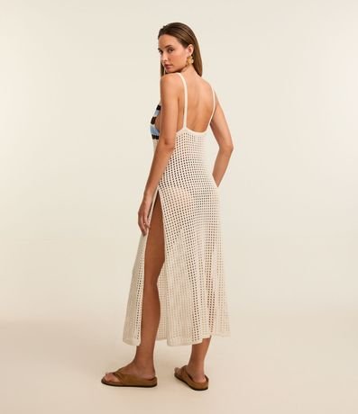 Ref: Vestido de tricô com efeito crochê. A peça tem alças finas e fixas que se alongam até as costas. As fendas laterais profundas e a textura furadinha fazem desse produto a saída de praia ou piscina ideal!