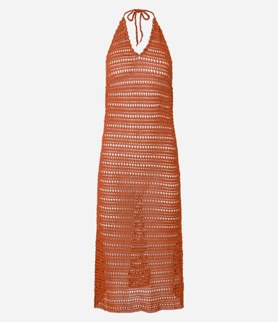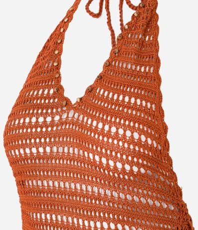Ref: Saída de praia confeccionada em crochê. O vestido sem mangas tem decote V com aviamentos de madeira.