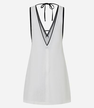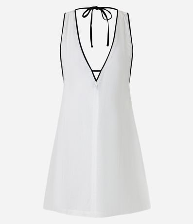 Ref: Saída de praia confeccionada em viscolinho sem estampa. O vestido curto tem cavas profundas, decote V e detalhe de vieses contrastantes.