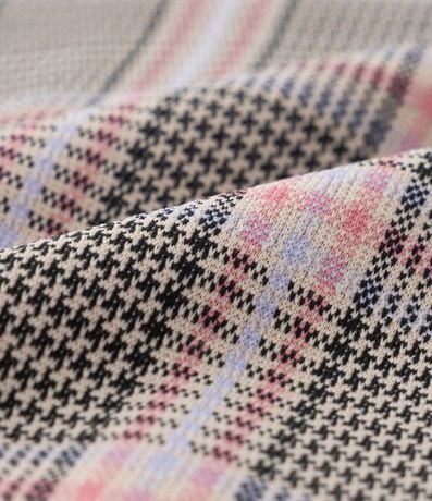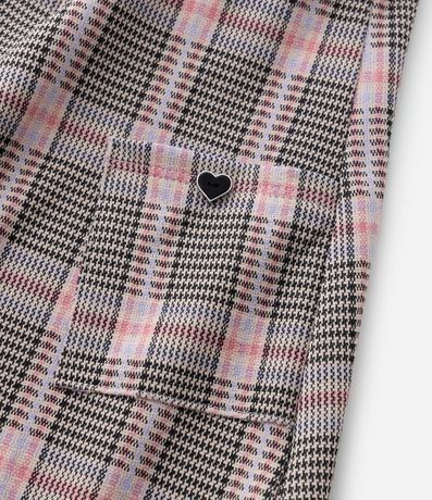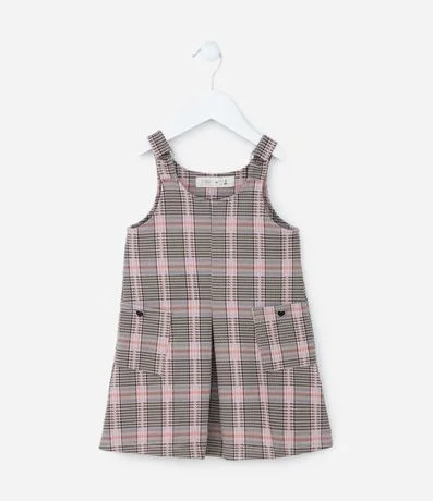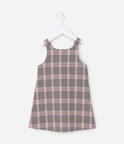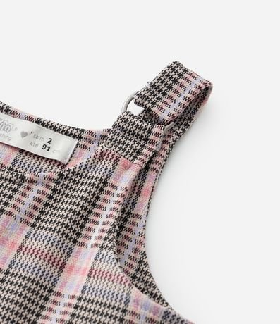 Ref: Salopete infantil com textura jacquard, alças largas, bolsinhos frontais e estampa xadrez. A peça ainda possui prega frontal.