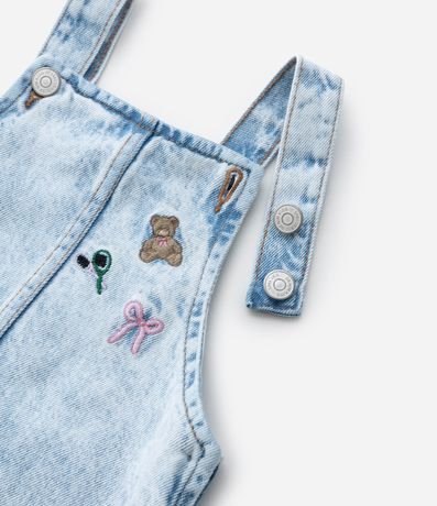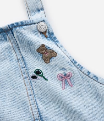 Salopete infantil confeccionada em jeans comfy, com decote quadrado, babadinho na barra e costura frontal. Como diferencial possui ícones divertidos bordados.