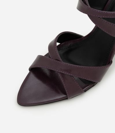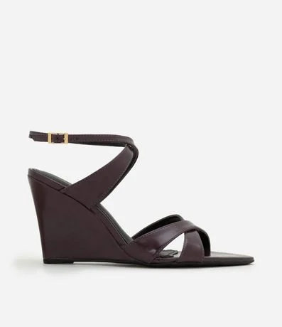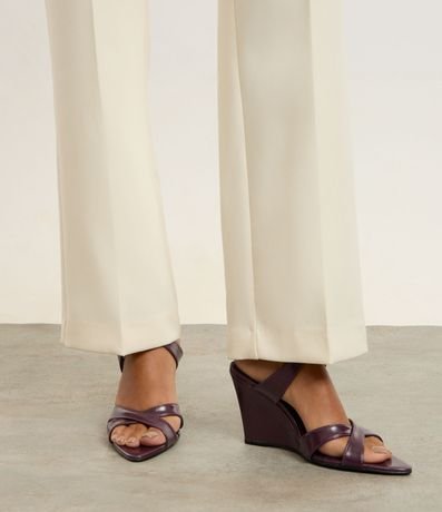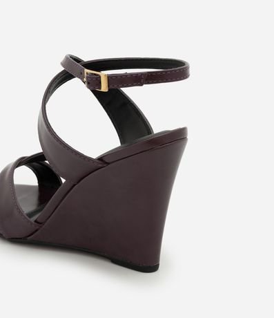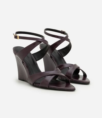 Ref: Sandália anabela feminina confeccionada em material sintético. Possui tamanho médio, jogo de tiras finas e médias que se cruzam sobre os dedos e o peito do pé, fechamento com uma pulseira no tornozelo e bico levemente folha.