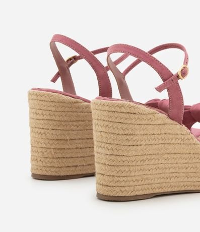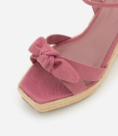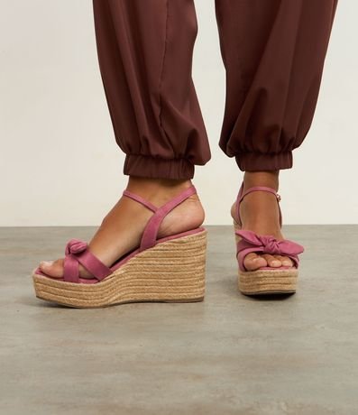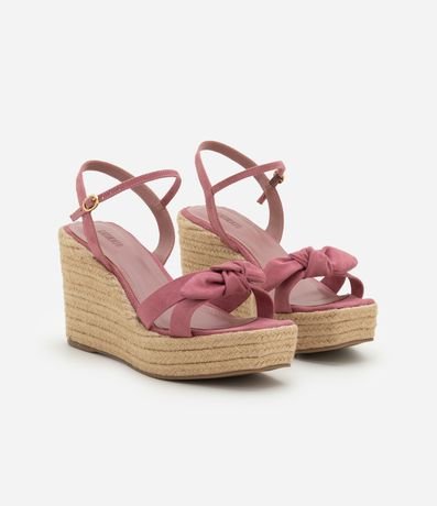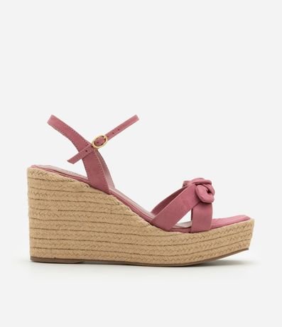 Ref: Sandália feminina anabela com bico quadrado, tiras com detalhe de nózinho e fechamento por fivela na panturrilha. Peça com salto alto em efeito ráfia.