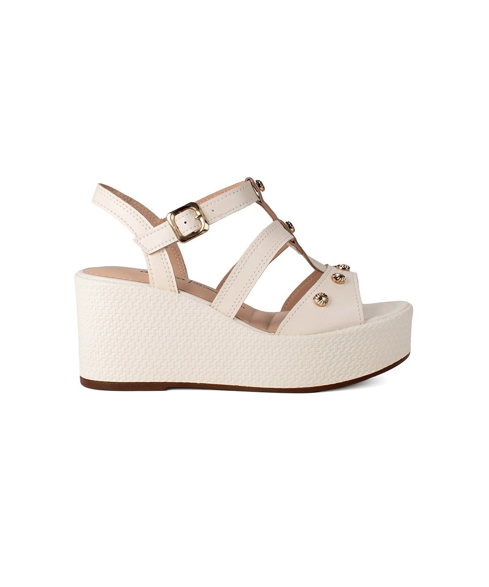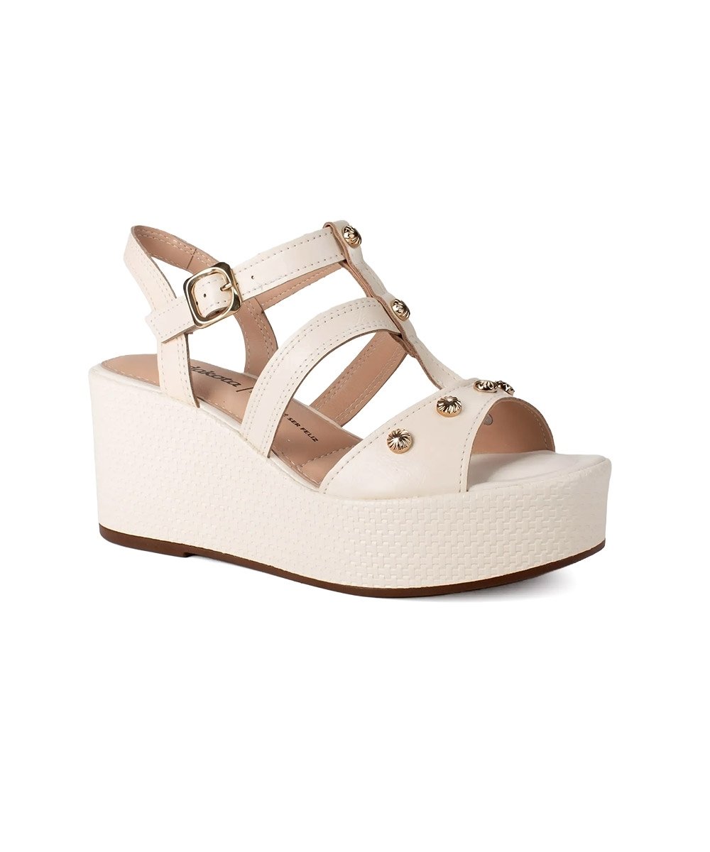 O destaque do modelo é o salto anabela de 8 cm, revestido em uma trama elegante que adiciona personalidade e um charme artesanal ao visual. As tiras delicadas na parte superior, decoradas com aplicações metalizadas, conferem brilho sutil e sofisticado, elevando a sandália a um patamar moderno e versátil. O fechamento por fivela no tornozelo garante ajuste seguro, firmeza ao caminhar e conforto para o uso prolongado.