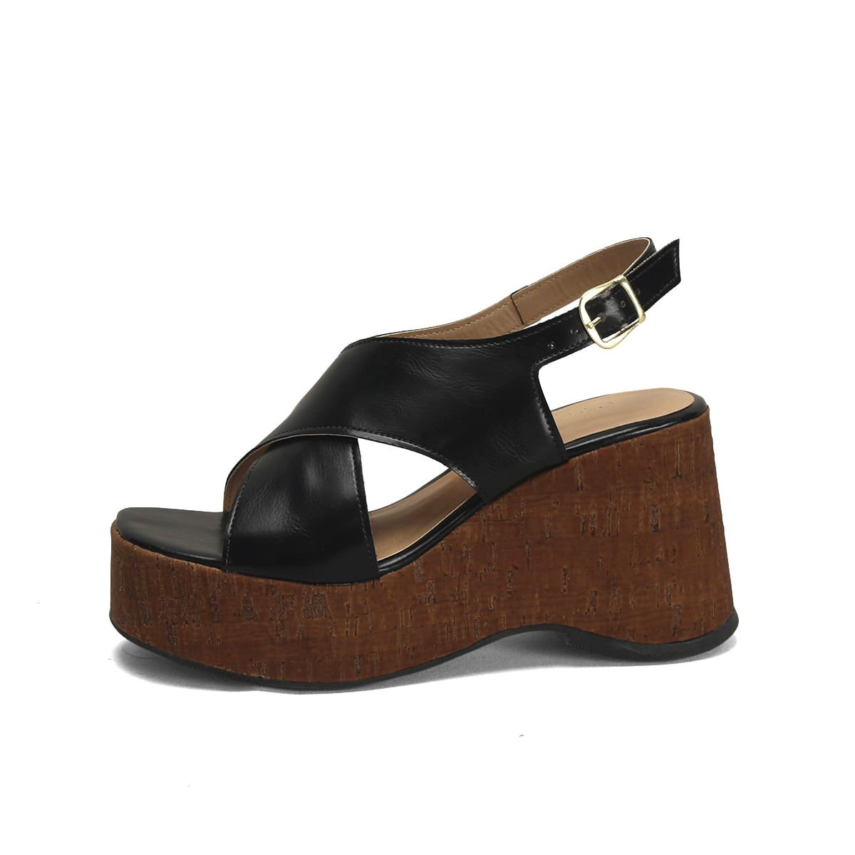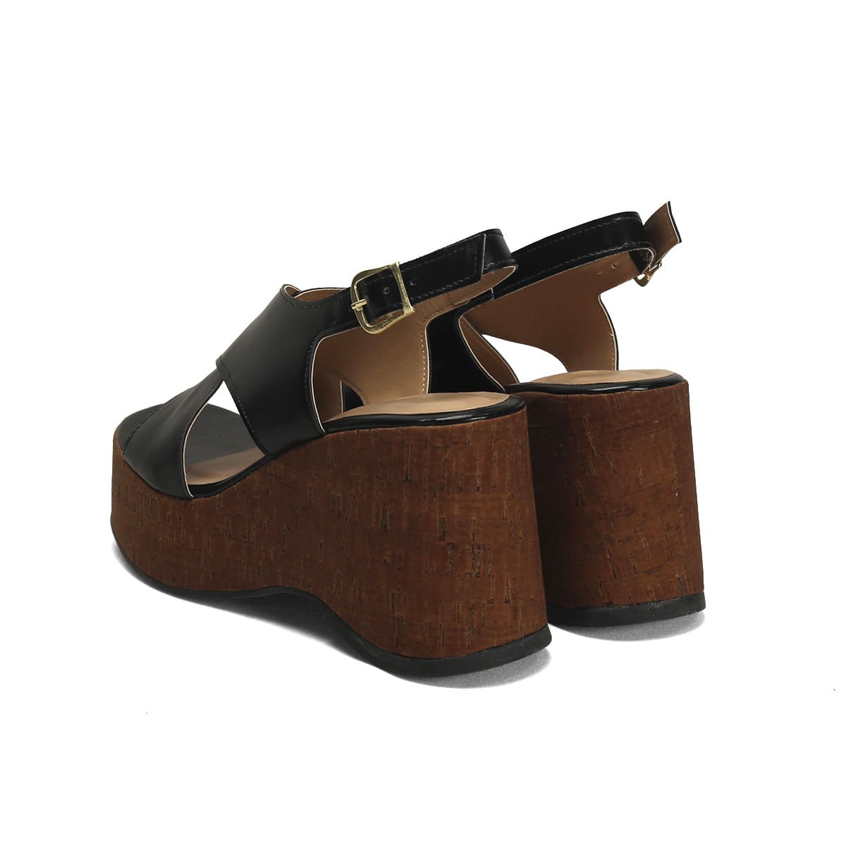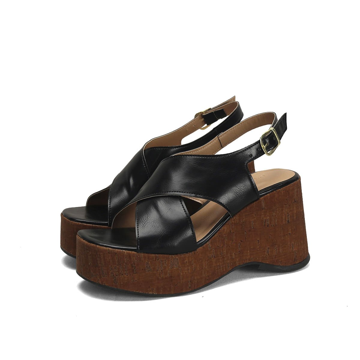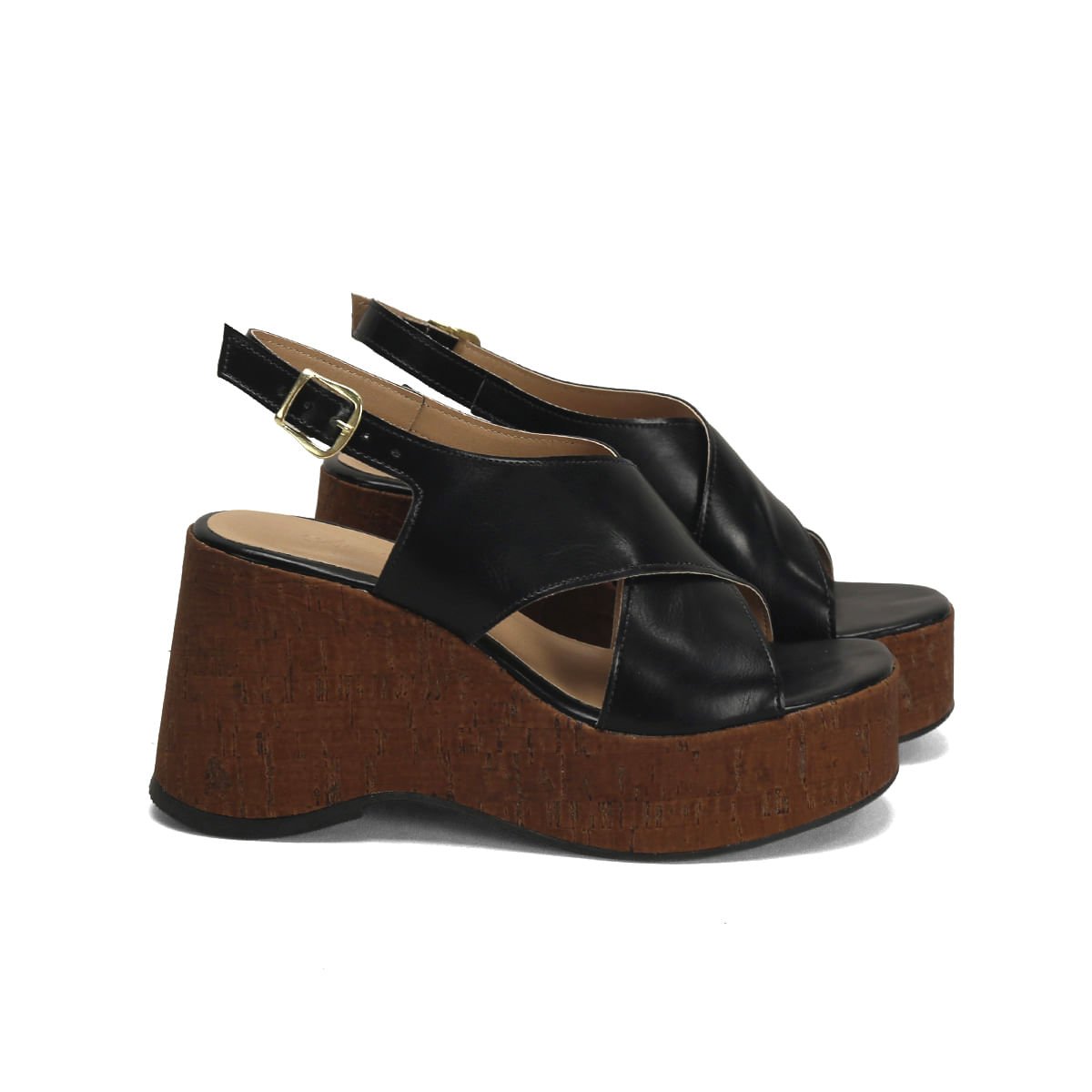 Sandália Anabela Tiras X Preta Cortiça Chocolate Salto 9cm Ana Mello