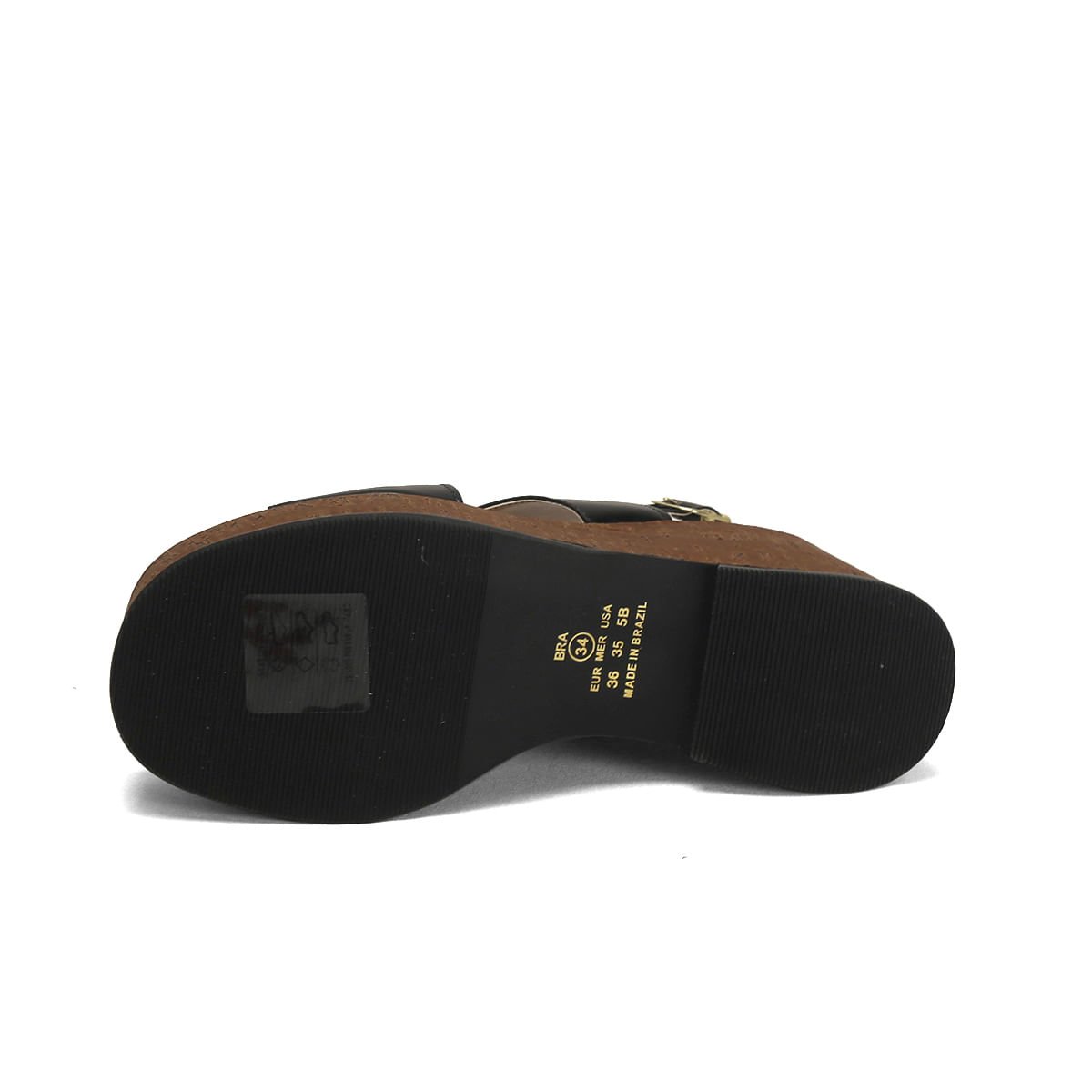 Destaque-se com elegância e conforto! Esta sandália anabela em Napa Preta possui um design moderno em X que valoriza seus pés. A palmilha macia e o salto de cortiça chocolate (9 cm) proporcionam leveza e estabilidade.