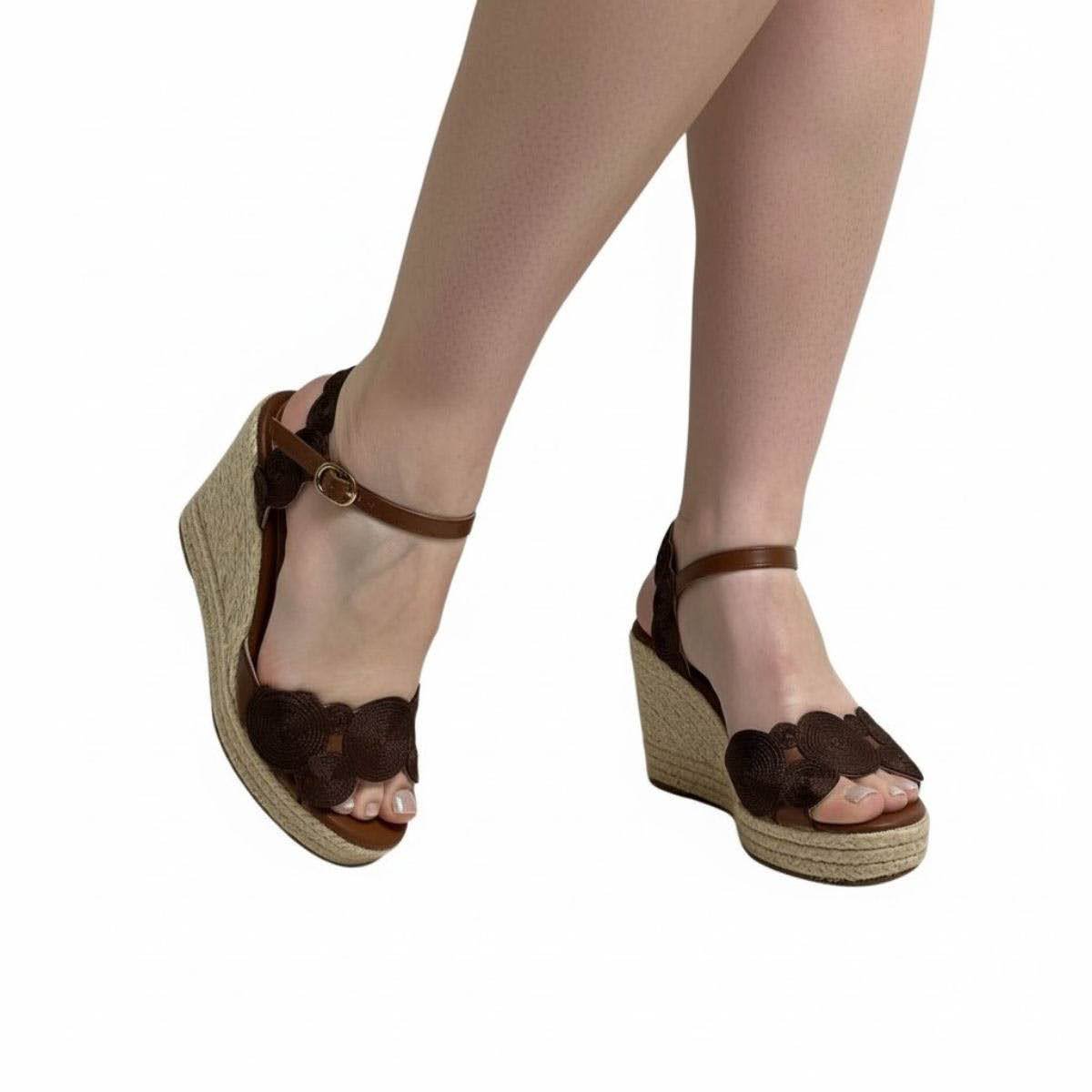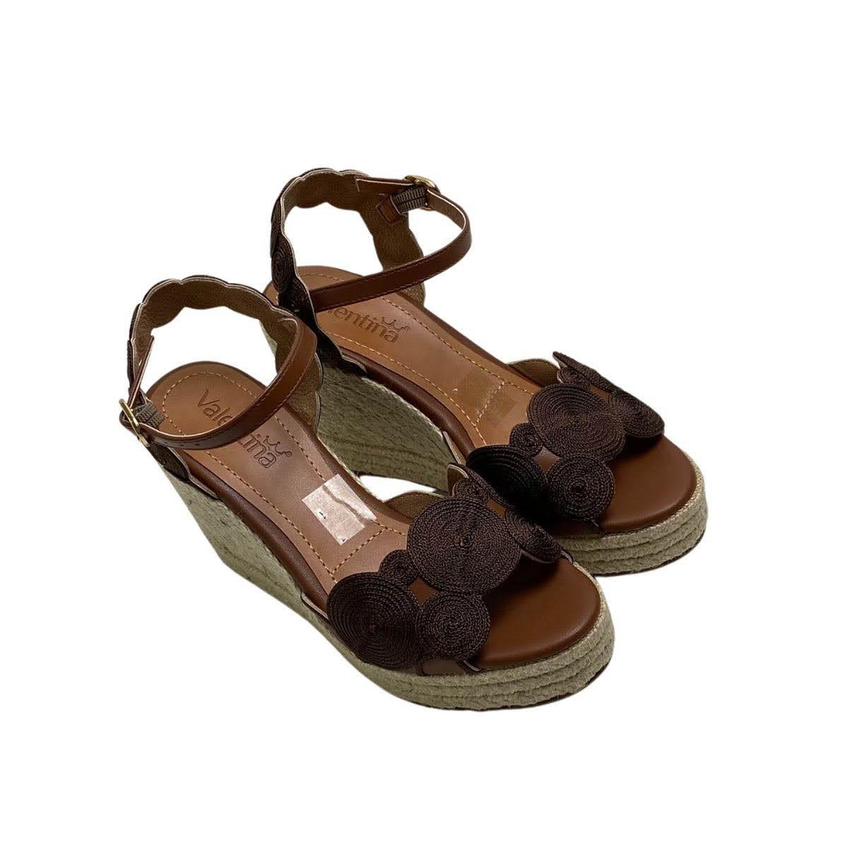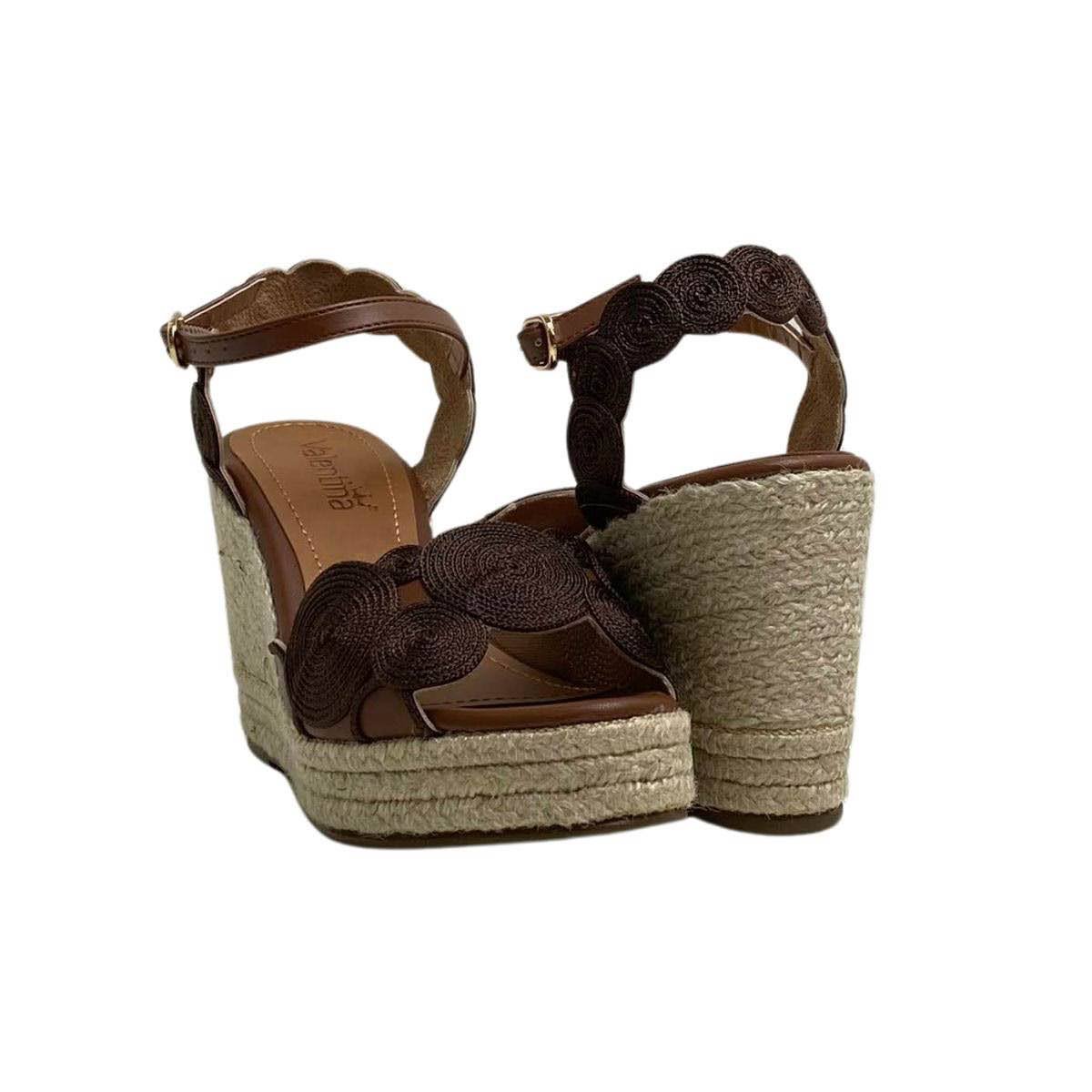 Ref: Sandália Anabela Valentina Feminina 502125 Marrom Escuro. A Sandália Anabela Bordada Valentina Flats é a escolha ideal para quem busca combinar altura, conforto e muito estilo, com um toque de charme artesanal. O salto anabela de 10 cm de altura proporciona uma elevação elegante e é adornado com corda (detalhe rústico espadrille), seguindo as tendências da moda. O cabedal bordado adiciona um charme artesanal e sofisticado à peça.