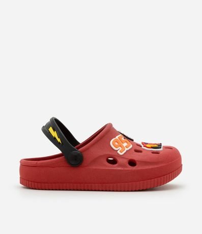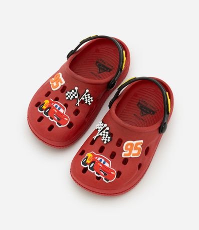 Sandália infantil de modelo babuche, com bico redondo, textura de furinhos e patches da animação Carros. Possui tira contrastante no calcanhar.