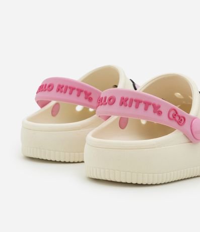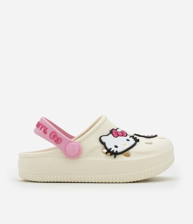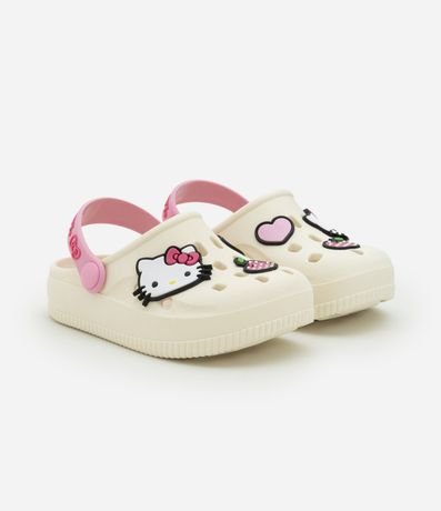 Ref: Sandália infantil de modelo babuche, com bico redondo, furinhos e tira de sustentação. Possui patchs da Hello Kitty no cabedal. Item confeccionado com material de origem biológica e processo de boas práticas sustentáveis.