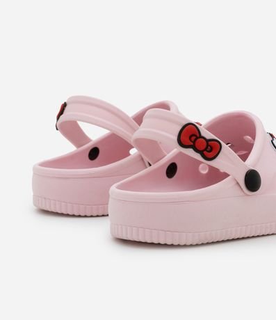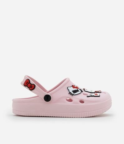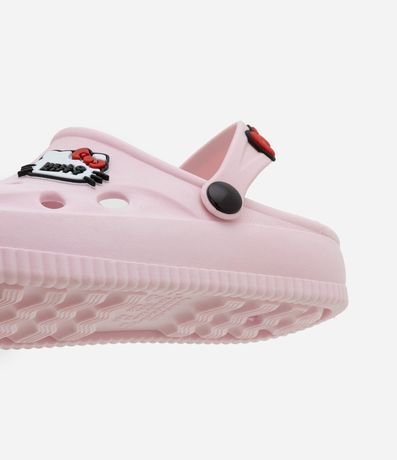 Ref: Sandália infantil de modelo babuche, com bico redondo, furinhos e tira de sustentação. Possui patchs da Hello Kitty no cabedal. Item confeccionado com material mais sustentável e processo de boas práticas sustentáveis.
