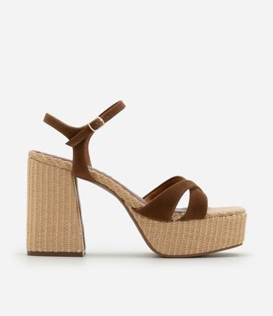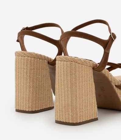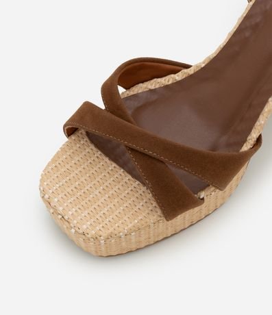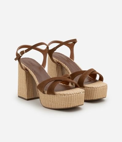 Ref: Sandália feminina com bico redondo em efeito ráfia, tiras finas em x com efeito camurça, tira fina com fivela lateral, salto alto com efeito ráfia.