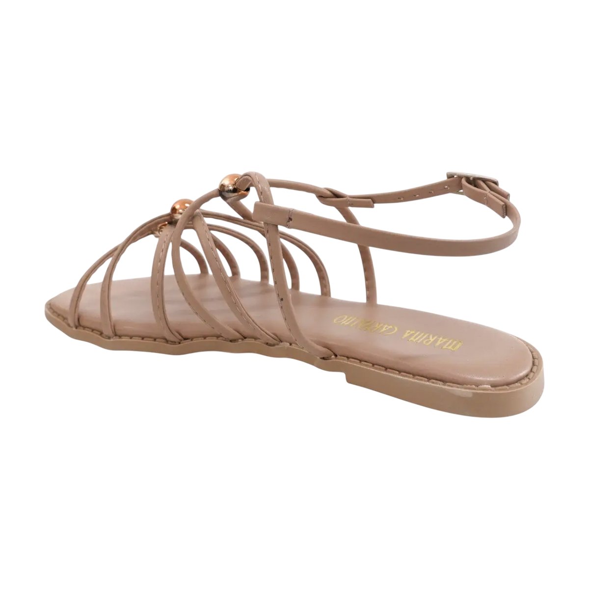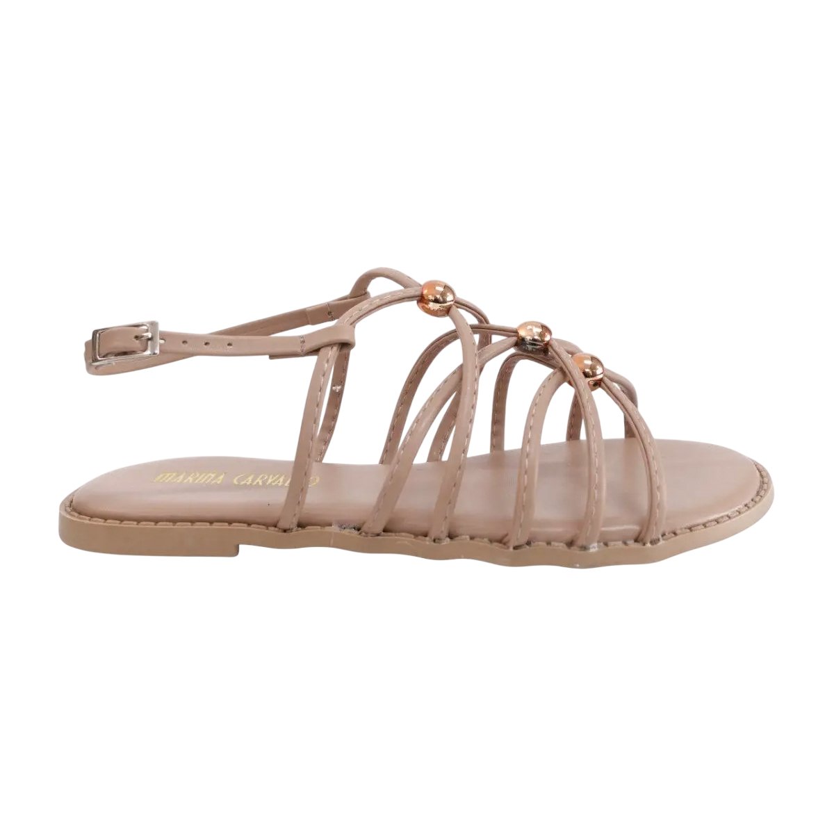 Tipo: Sandália rasteira feminina com tiras finas e acabamento metálico nos detalhes