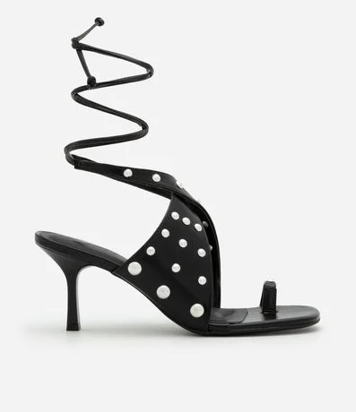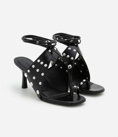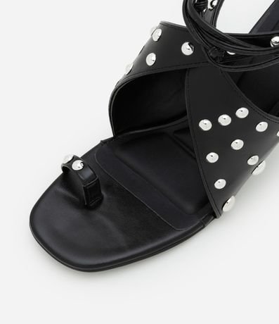 Sandália feminina confeccionada em material sintético com bico quadrado, dedal com alça larga transpassada, alça fina longa com aplicação de studs, salto médio fino.