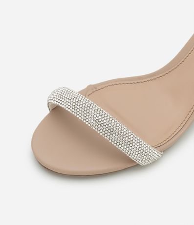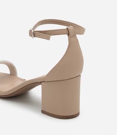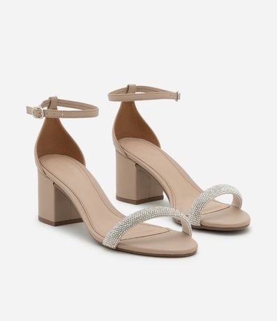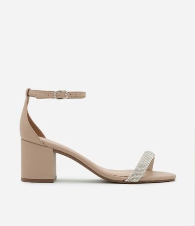 Sandália com fechamento no tornozelo com fechamento por fivela, tiras no cabedal com strass cravejado, bico redondo e salto bloco.
